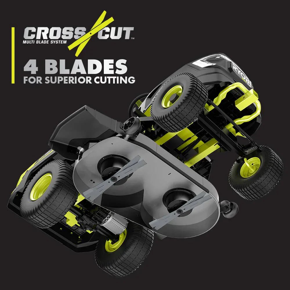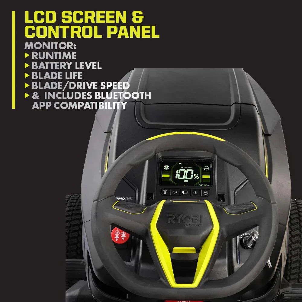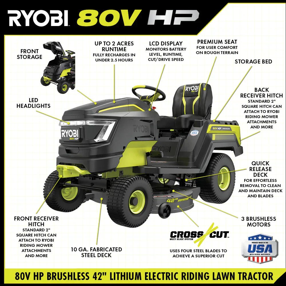 Introducing RYOBI’s first lithium-ion battery powered Riding Lawn Tractor, the RYOBI 80V HP 42″ Lithium Electric Riding Lawn Tractor. 80V HP Technology combines brushless motors, advanced electronics, and lithium-ion batteries to deliver the power equivalent to a 21 horsepower gas engine*, delivering all the power, without gas, engine maintenance, and significantly less noise. This tractor is powered by 3 brushless motors and 3 80V 10Ah batteries to cut up to 2 acres per charge. When the job is done, the tractor fully recharges in less than 2.5 hours with the included Hyper Charger and on-board charging port. The most versatile Riding Lawn Tractor in the industry features front and rear storage compartments to haul mulch, logs, plants, or any material around the yard. Make quick work of towing, with a capacity of 500 lbs. and a universal 2″ square hitch in the front and rear of the Tractor. The Tractor is equipped with a 10-gauge heavy-duty fabricated steel deck and the CROSS CUT multi-blade system that uses 4 steel blades to achieve a superior cut. Remove the deck in under 90 seconds for quick blade maintenance. The full color back lit LCD screen displays runtime, battery level, and charge status while the RYOBI Riding Mower app allows you monitor your charge status from your phone. Mobile Service available in select regions. If your riding mower requires attention, a certified RYOBI support technician can diagnose & service right from your home. Some services may require you to bring your mower to one of the 300+ service centers nationwide. This Tractor is proudly made in the USA with globally sourced materials and has a 5-year limited warranty.