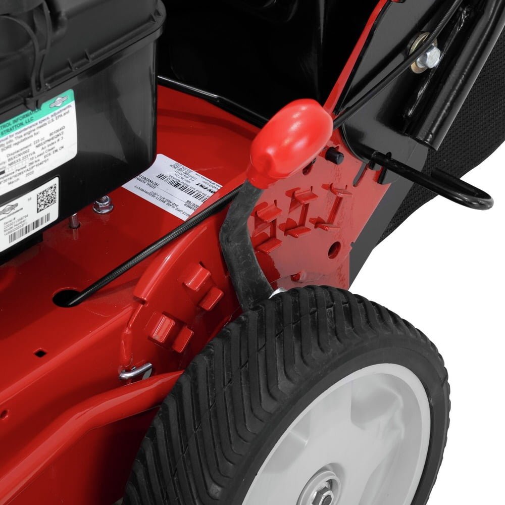 - Semi-pneumatic 10 in. rear wheels are designed to help push over the yard’s rough spots and uneven terrain